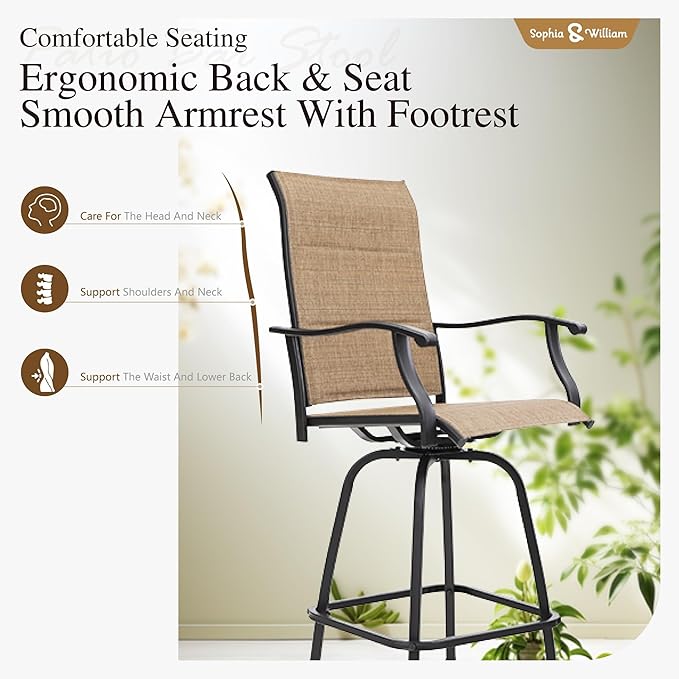 - Humanized Swivel and Rocking Design: Smooth 360 degrees rotation for easy turn around on your seat, so you can move your waist and legs when have a long time seating. It is great for promote your blood circulation. Slight rocking design makes you feel relax. You can enjoy your daily leisure time as any posture you like in this functional patio bar stools