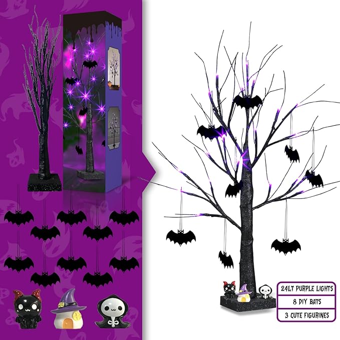 - Lighted Halloween Decor: Light up 24" black twig tree with beautiful spooky purple lights. The superposition of bats and purple lights gives a ghostly effect. Perfect as decorations for room, table, fireplace, window sill, dining table