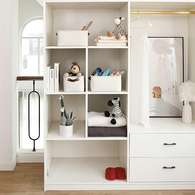 - Multipurpose Closet Storage Bins – A smart choice for keeping your life neat and organized these storage bins for shelves and closet spaces can be used for clothes, kid’s toys, nursery room items, extra linens, laundry, towels, sheets, and more.
