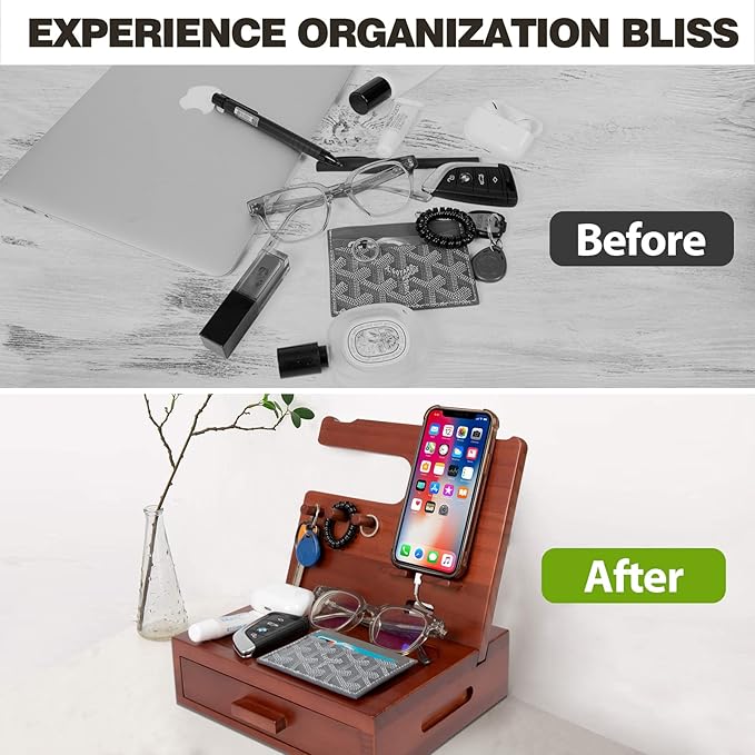 - Multifunctional Charging Station & Organizer: Perfect solution for staying organized while charging your phone. With a compact size, this charging station fits easily on your desk, nightstand, or any other tabletop surface. It is designed to hold your phone while it charges, as well as provide convenient storage for your daily essentials.