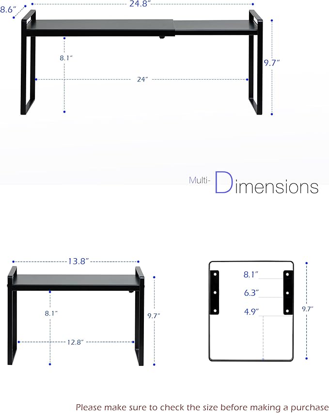 - WIDTH EXPANDABLE and HEIGHT ADJUSTABLE: This cabinet shelf features a powerful design that allows not only for width adjustment but also for height adjustment, catering to your specific needs. Its width can be adjusted from 13.8 inches to 24.8 inches, and it offers three height settings of 4.9 inches, 6.3 inches, and 8.1 inches above the surface.