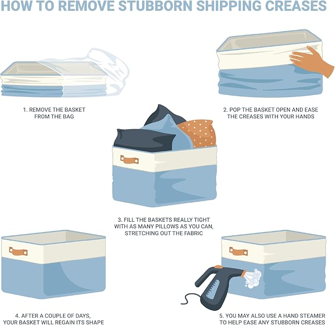 - Decorative Fabric and Vegan Leather – These versatile storage baskets for organizing your everyday life are made with a thick, high-quality fabric and fitted with leather handles to add a stylish touch to a living room, bedroom, office, or personal space.