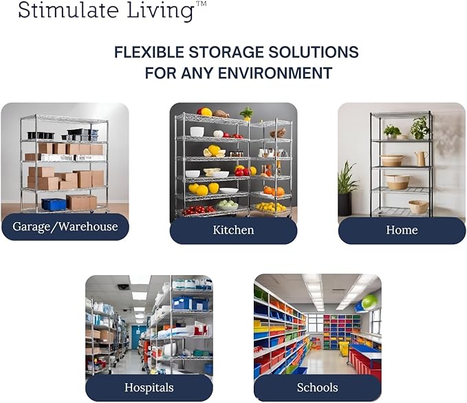 - ★FLEXIBLE USAGE★ Our Stimulate Living Wire Shelving is designed to be flexible and adaptable to a wide range of settings. It can be used in warehouses to store heavy equipment, in kitchens to hold cooking utensils, in garages to organize tools, in hospitals and laboratories to store medical supplies, in offices to keep files and documents, in retail stores to display merchandise, in restaurants to store kitchenware, in industrial and factory spaces to hold raw materials, and more.