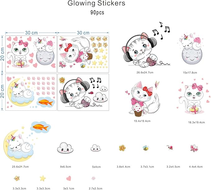 - 【Glow in the Dark Stickers】- These Cats wall stickers are made of quality luminous material. A total of 88 pieces include cats, clouds, stars, butterflies, bees, flowers and other elements, which can be freely combined. It’s a lovely graphic decoration during the day and glows in the dark at night.