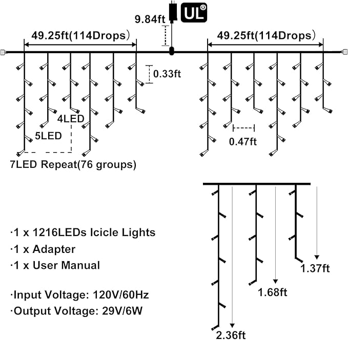 - 【Low Voltage & UL Certification】The output voltage of the icicle Christmas lights outdoor is 29V, the power of adapter is 6W with UL certified, energy saving and safe to use. The outdoor Christmas lights for house not overheat even after working for a long time and safe to touch.