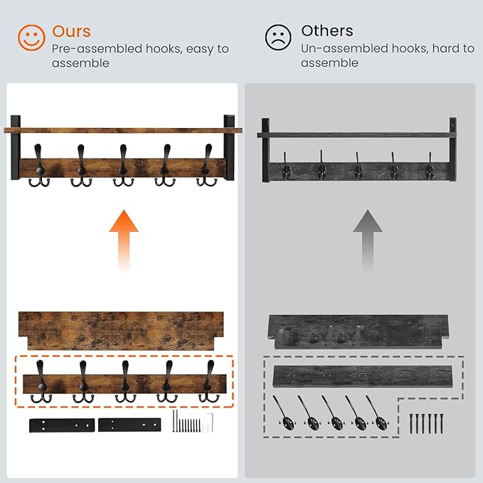 - 2-IN-1 DESIGN: With a 24" long 4.52" deep top shelf, the coat rack wall mount offers additional storage space for displaying photo frames, potted plants, and other collectibles, while the 5 tri hooks underneath provide ample storage for clothes, bags, keys, umbrellas, and more