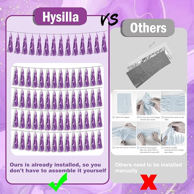 - 【Light Purple Party Supplies Set】: The total length of the light purple birthday tassels banner is 39.3 feet, divided into 4 strips, each 9.8 feet long. Each banner contains 15 tassels, and each tassel measures 14 inches, for birthday decorations many occasions, and so on