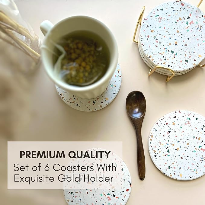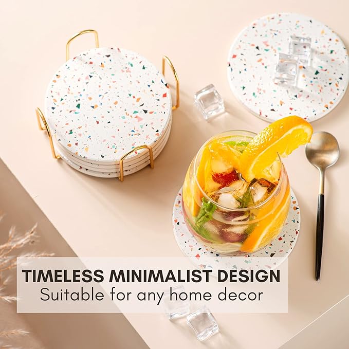 Terrazzo Drink Absorbent Coasters with Holder Set of 6, Ceramic Coaster for Drinks, Coffee Table Decor, Water Absorbing Stone Coaster for Drinks (Confetti)