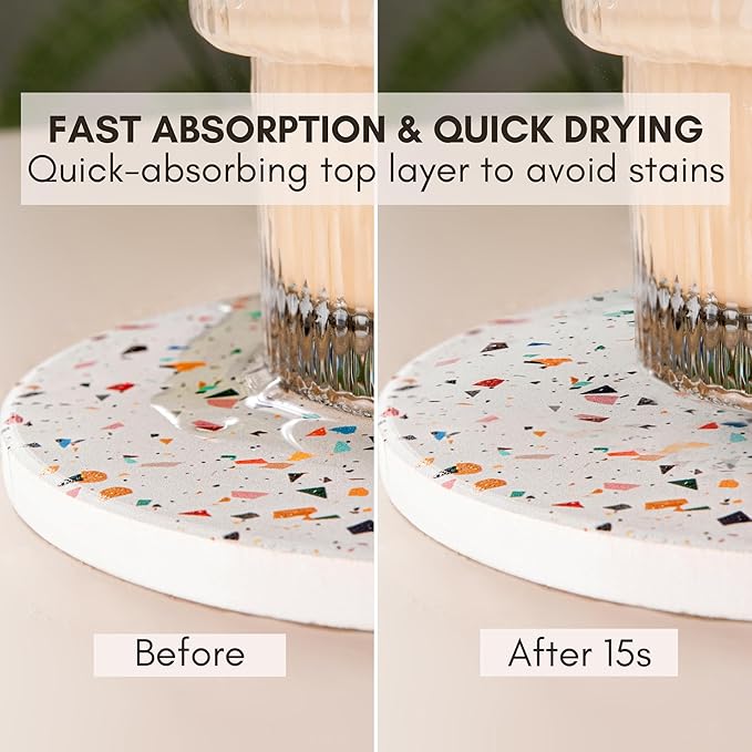 - Highly Absorbent for Hot & Cold Drinks: Our absorbent coasters are made of quality diatomite that absorbs condensation from cold drinks, spills from hot drinks and the absorbency will not detoriate over time.
