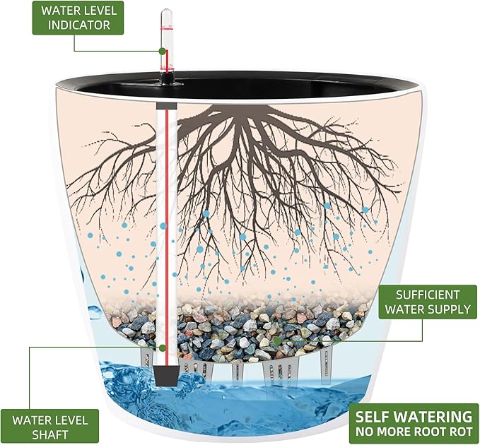 - NEVER MISS WATERING AGAIN - The hydroponic device keeps water ready, then watering time is at your discretion on the gauge. The design of drainage plug and spillway hole is to avoid cycles of overwatering and underwatering, pull out the plug to drain the excess water on rainy days outdoors. The sufficient water supply system enables double the water-efficient than conventional pots. Don't be anxious about missing watering while you enjoy a long term holiday on a journey or travel outside