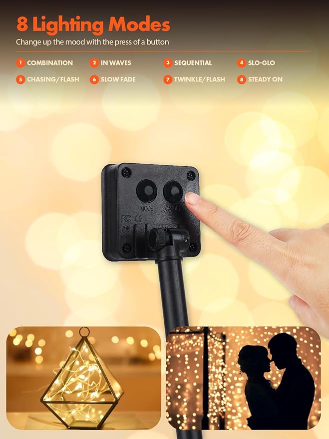 - 8 Lighting Modes with Memory Function: Our solar string lights have 8 lighting modes for you to choose: combination, in waves, sequential, slo glo, chasing/flash, slow fade, twinkle/flash, and steady on. Comes with memory function, remember last setting automatically after turn off the power, no need to reset again.