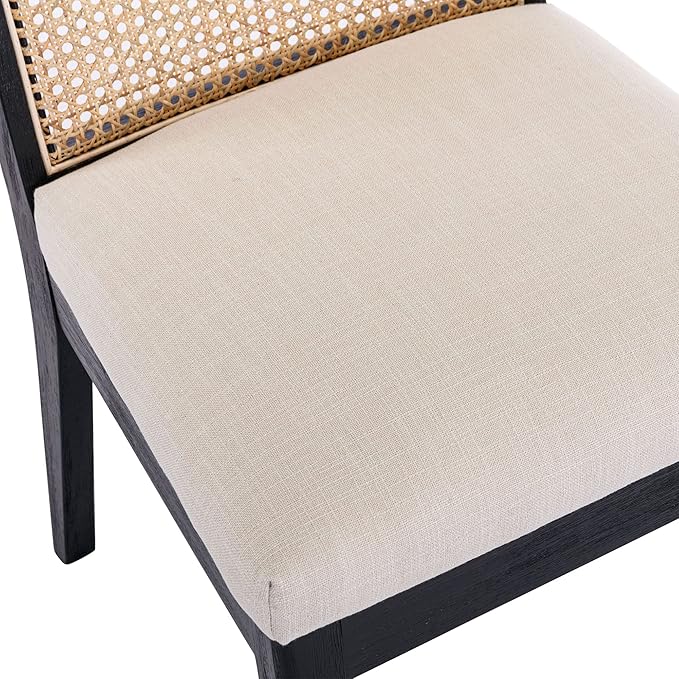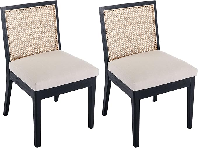 VESCASA Upholstered Dining Chairs with Square Rattan Back, Armless Padded Linen Cushion Dining Chairs with Wood Legs for Dining Room, Kitchen, Set of 2, Black Frame