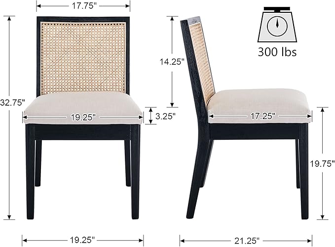 - UPHOLSTERED SEAT These padded dining chairs have a 19.25" W upholstered seat cushion and a 14.25" H x 17.75" W square rattan back, the soft cushion seat allows you to sit more comfortably