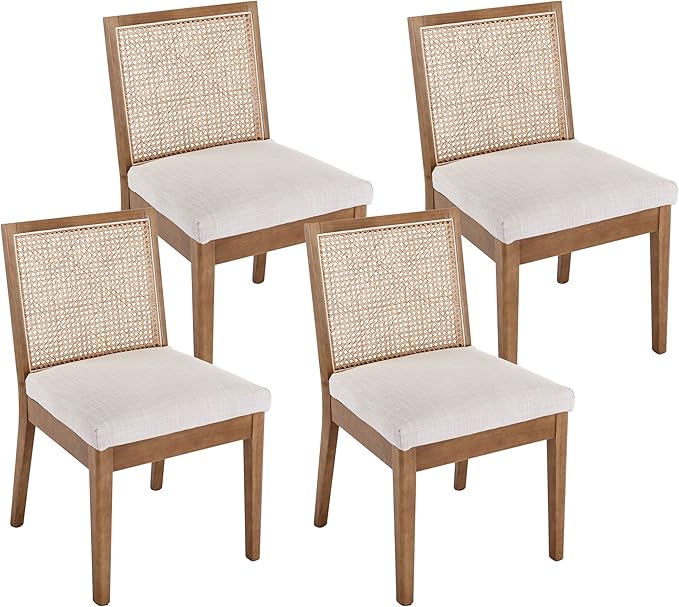 VESCASA Upholstered Dining Chairs with Square Rattan Back, Armless Padded Linen Cushion Dining Chairs with Wood Legs for Dining Room, Kitchen, Set of 4, Natural Frame