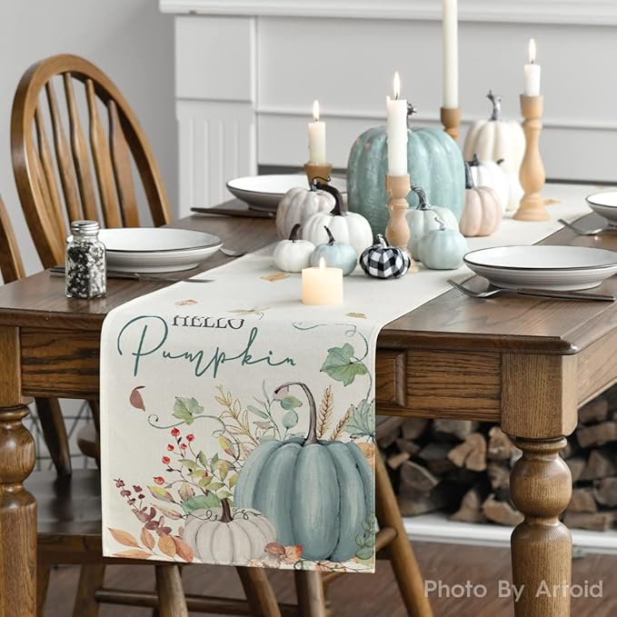 Artoid Mode Aqua Hello Pumpkin Leaves Fall Table Runner, Seasonal Autumn Kitchen Dining Table Decoration for Home Party Decor 13x120 Inch