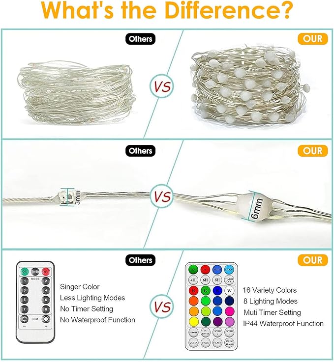 - Upgraded Twinkle Lights USB Operated: This fairy string light comes with a remote, providing 16 color variations for various occations. Effortlessly set your preferred colors for any occasion and relish its enchanting decorative effects. Decorate indoor scenes with different solid colors and colorful lighting effects