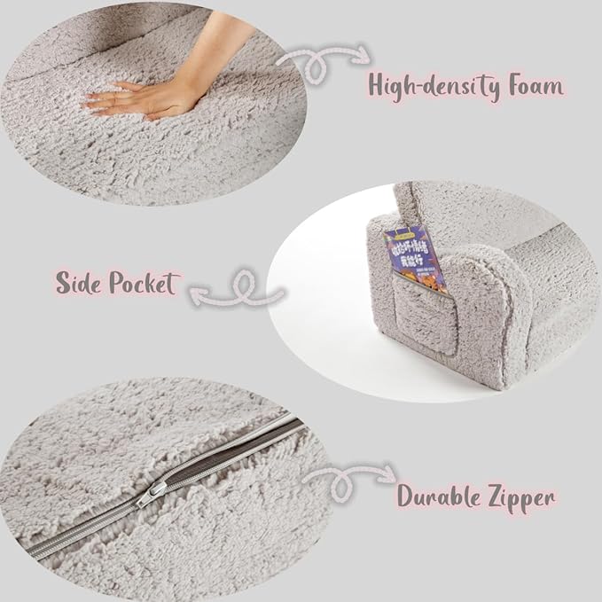 - Kids Sherpa Chair Safety and Reliability: The kids sofa chair is made of durable snuggly-soft polyester Sherpa and is filled with premium foam to support kid's body. The sofa is designed with safety in mind, as there are no sharp corners or hard edges.