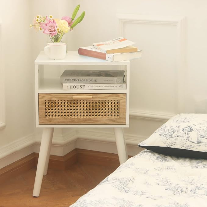 MaxSmeo Nightstand with Charging Station, Bedside Tables with Rattan Drawer, Mid Century Modern Nightstand, End Table for Living Room, Bedroom and Small Spaces, Easy Assembly (White)