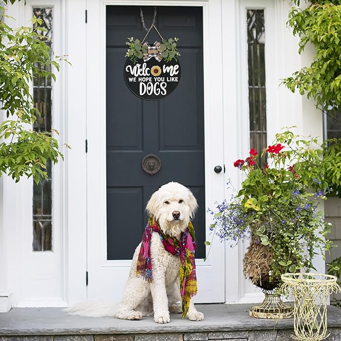 - UNIQUE DESIGN: The interchangeable welcome sign features the impressive letter "Welcome We Hope You Like Dogs" paired with exquisite buffalo plaid bows, vibrant eucalyptus leaves, and 14 interchangeable logos. It not only ensures a charming appearance, but you can also change the variable icon of the wreath to change the front door decoration. At the same time, this is also a friendly and hospitable way to remind your guests that you have a dog and extend the warmest welcome to your friends.