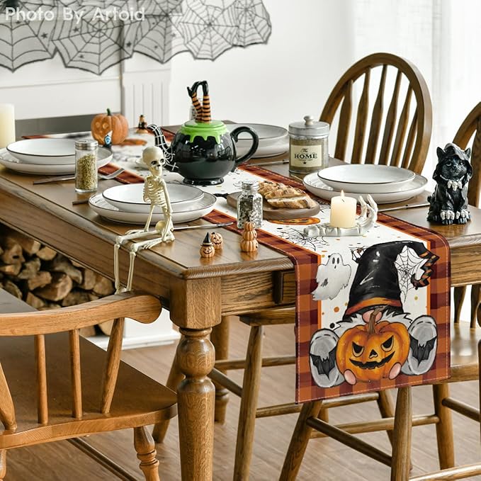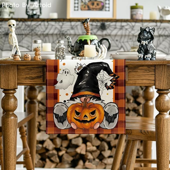 Artoid Mode Orange Black Buffalo Plaid Gnome Bat Pumpkin Ghost Halloween Table Runner, Sensonal Kitchen Dining Table Decor for Home Party 13 x 72 Inch
