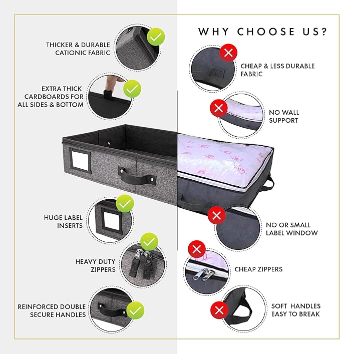 - ๐๐ฑ๐ญ๐ซ๐ ๐๐ก๐ข๐๐ค ๐๐ญ๐ฎ๐ซ๐๐ฒ ๐๐๐ซ๐๐๐จ๐๐ซ๐๐ฌ: Unlike most under bed storage box, Homelux Theory's under the bed storage containers come with extra thick cardboard on each side and bottom part to help hold their shapes and withstand frequent use & heavy loads. While other under box for clothes and shoe organizer under bed storage in the market usually has flimsy sides made of thin, lightweight materials, our timeless storage boxes for under bed are crafted for long-term durability and reliable performance.