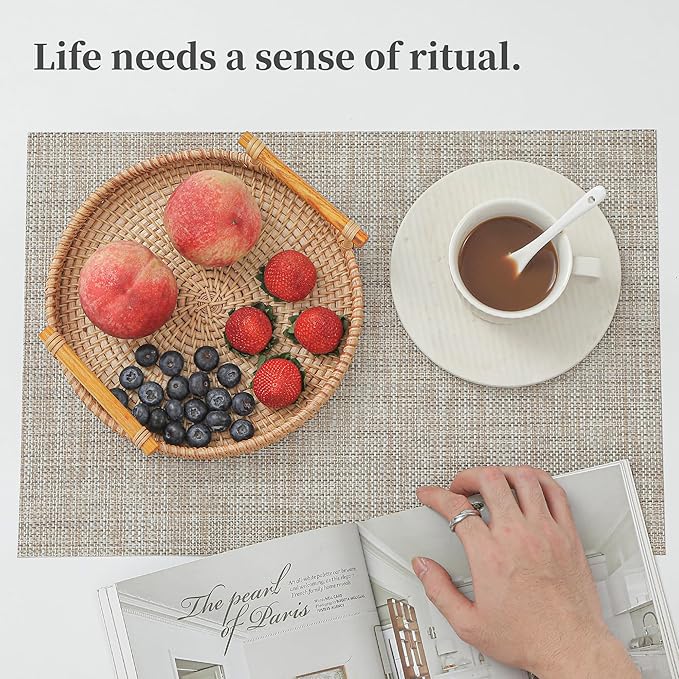 - Elegant and Practical Design: With a luxurious vinyl woven texture, precision cutting, and heat-trimmed edges, our double-sided placemats offer a sophisticated and practical solution. They provide a non-slip surface, resist fading, and are easy to clean, elevating your dining experience.