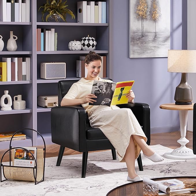 Yaheetech Mid-Century Accent Chairs, PU Leather Modern Upholstered Living Room Chair, Cozy Armchair Button Tufted Back and Wood Legs for Bedroom/Office/Cafe Black