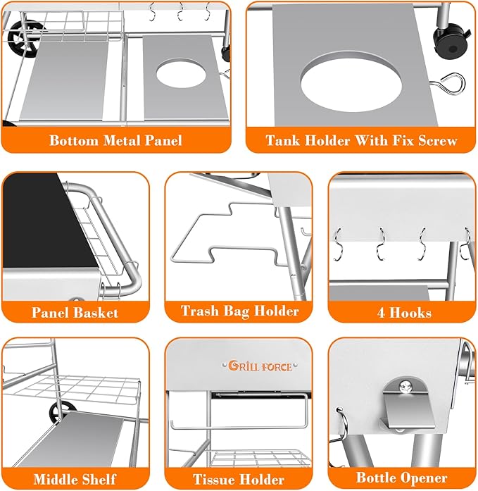 - 【Additional Features for Convenience】The outdoor grill stand includes a condiment rack to keep sauces and toppings organized, four S-hooks for hanging tongs, brushes, and pizza peels, and a trash bag holder for easy waste disposal. It also features a paper towel holder and a bottle opener, ensuring everything stays neat and accessible, creating a professional cooking experience.