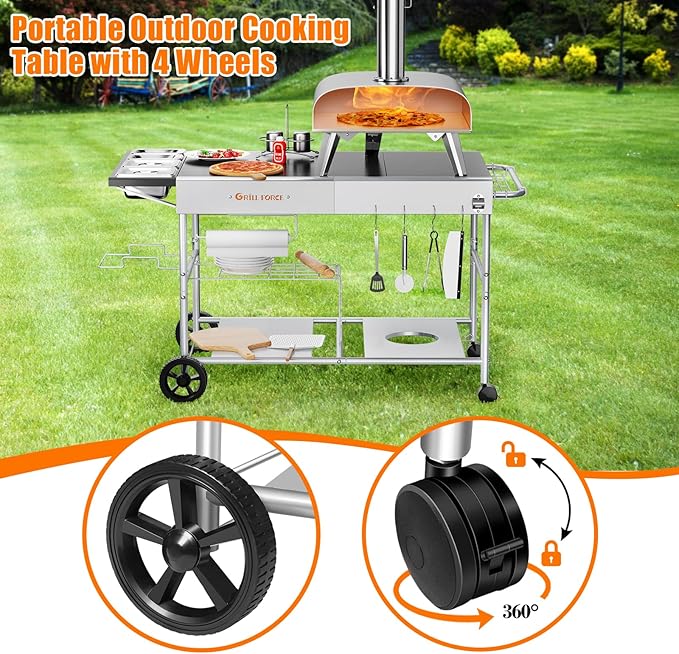 - 【Easy Assembly】The portable table comes with clear instructions that are very easy to follow, making assembly a breeze. It can be used as an outdoor pizza station, kitchen island, storage cart, patio table, BBQ cart,outdoor bar table, or backyard cart.
