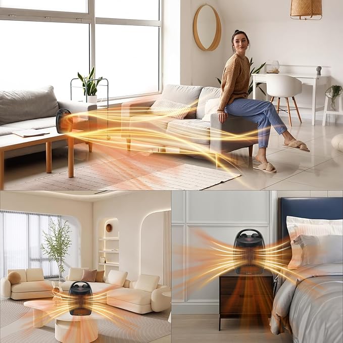 - Efficient and Quiet Heating: Operating at noise levels below 45 decibels, the portable heater ensures a serene ambiance conducive to bedroom use while sleeping. Leveraging PTC ceramic heating technology and a high-speed fan, it promptly emits substantial warmth within seconds, rapidly elevating the temperature in areas spanning up to 200 square feet.