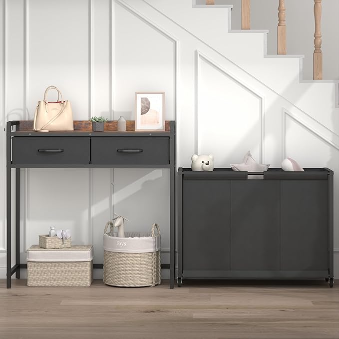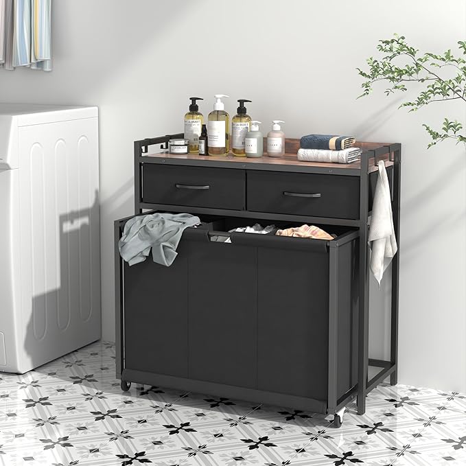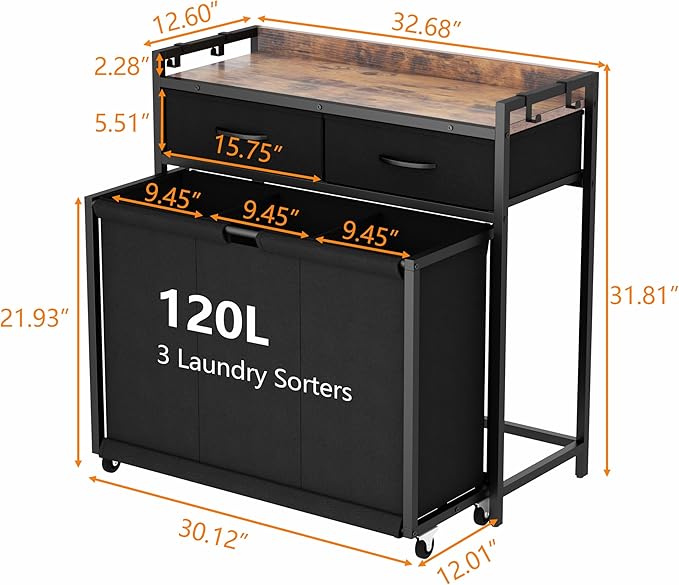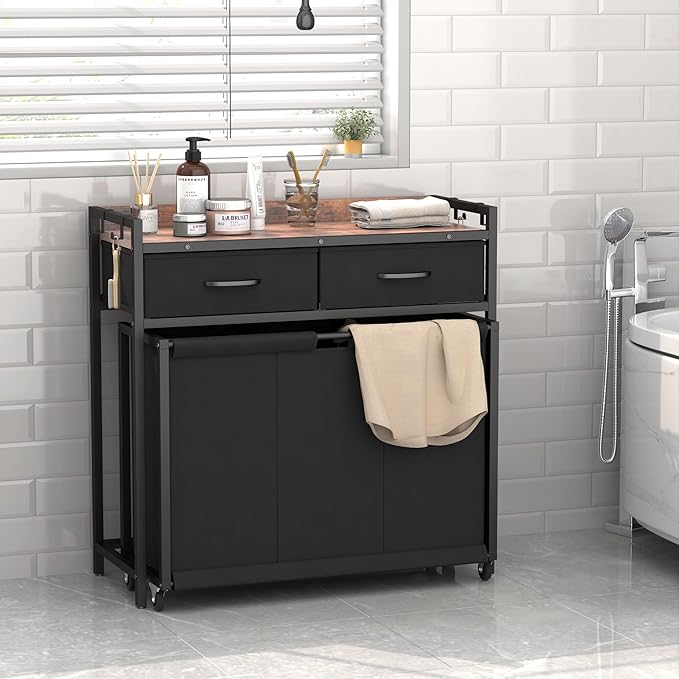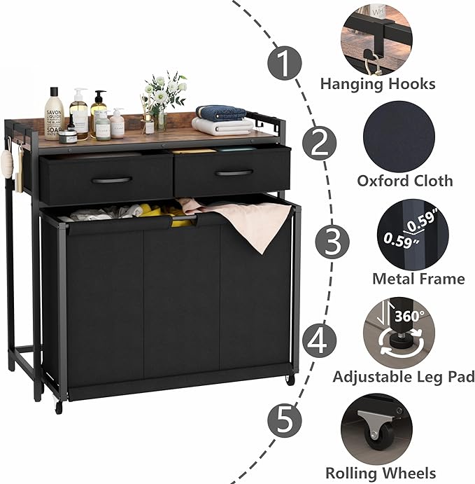 - [Easy Assemble & Reliable Construction] The entire laundry hamper consist of two pieces which are respectively console table with drawers and rolling laundry bags. Both of them utilized powder-coated steel tube as structure, especially the laundry basket choose round tube to reduce wear and tear on fabric. The package comes with clear assembly instructions and numbered parts, you will get a rolling laundry hamper in 30 Minutes.
