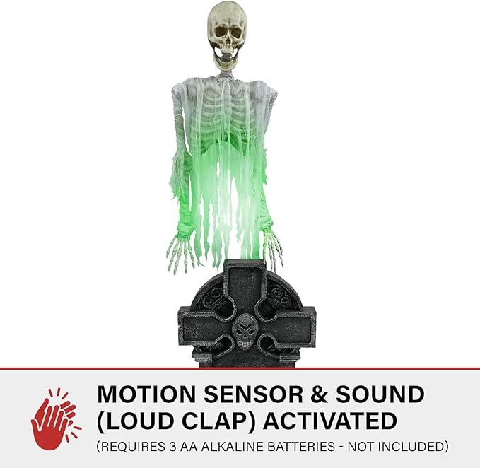 Haunted Hill Farm Motion Activated Floating Skeleton Ghost Over Tombstone by Tekky, Battery Operated Halloween Animatronic for Indoor or Covered Outdoor Creepy Halloween Decorations, Halloween Props
