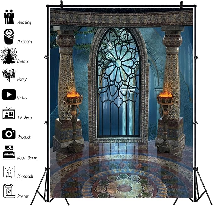 Renaiss 10x12ft Medieval Castle Backdrop for Photoshoot Portrait Pillar Torch Gothic Stone Tower Ancient Old Fortress Interior Photography Background Halloween Party Decor Wallpaper Photo Studio Props