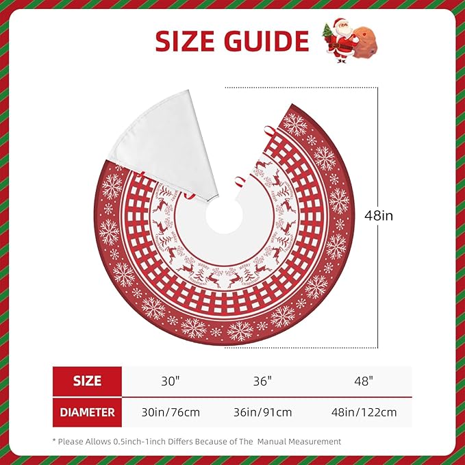 - Ideal Size for Christmas Tree: The Christmas tree skirts design size is 48 inches with classic Christmas element, fit any size Xmas trees. You can put your favorite gifts on the tree skirt to add more festive atmosphere.