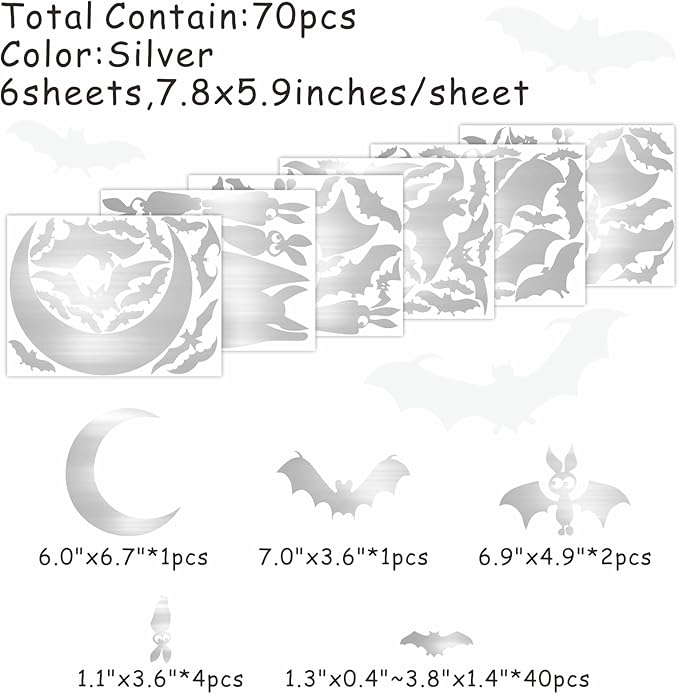 - Bats mirror stickers include :7.8 x 5.9 inches /sheet , 6 sheets, (moon size :6.0’’x6.7’’x1pcs,bats size : 7.0’’x3.6’’~1.3’’x0.6’’x69pcs).