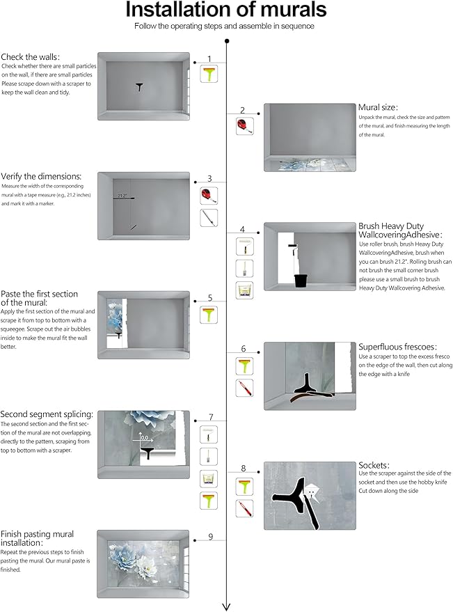 - Construction Installation: Each part of the mural is marked with a serial number underneath, no overlap, direct docking, in order. (Please refer to installation instructions)
