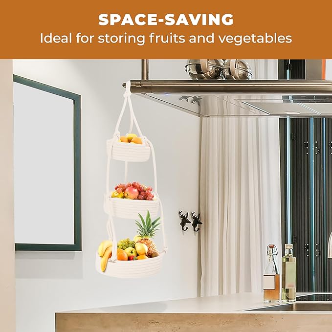 - SPACE-SAVING: This 3 tier hanging basket is perfect for storing fruits and vegetables, its versatile design lets you save space on your countertops while serving as a stylish fruit hanging basket.