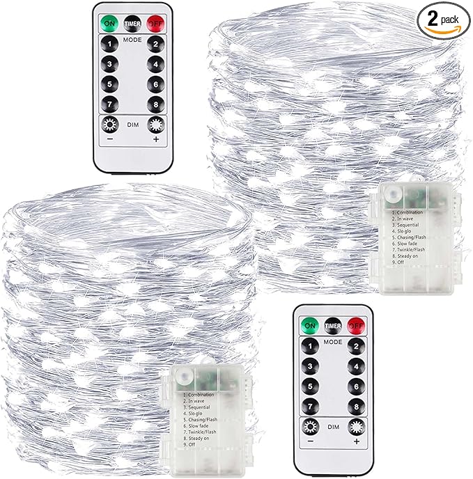 2 Pack 200LED Battery Operated Fairy Lights with Remote, 8 Modes LED String Lights with Timer, Dimmable, Memory Function, Waterproof Twinkle Lights for Outdoor Indoor Christmas Decor(Cool White)