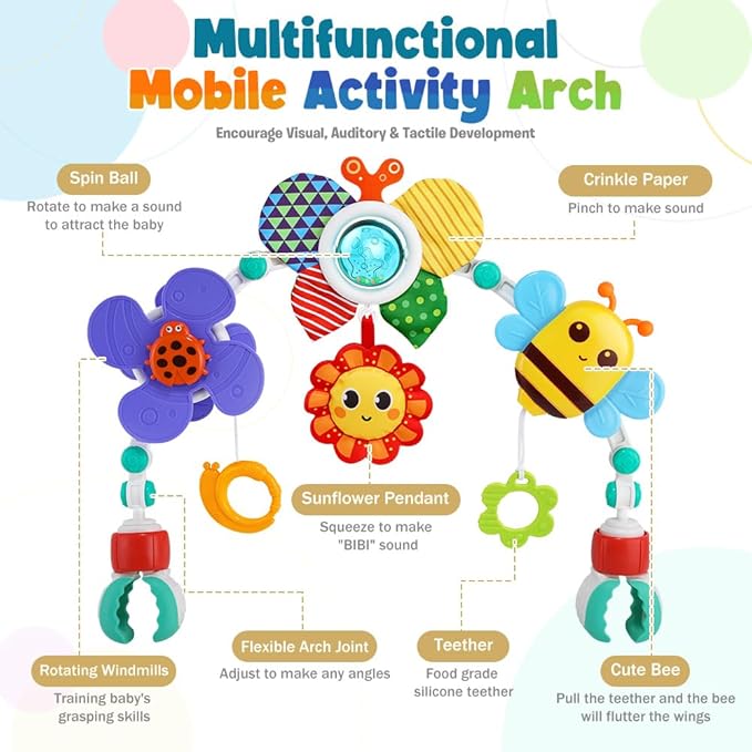 - Fun Play to Keeps Baby Busy:Our car seat toys is an animal theme early development toys. The windmill will spin by little hand grasps and pulls down the snails handle. Detachable sunflower hanging toy will make BIBI sound by squeezing. Also cute bee and crinkle butterfly with rattling ball will attract your baby's attention and they will not boring at home or traveling.