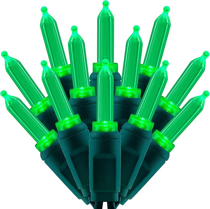 - SPECIFICATIONS ☀ Each pack contains 1 strands of one-piece string lights, total length 33 feet with 100 count green mini lights. 22 AWG green cord, 4" lead, 4" spacing, 4" tail.