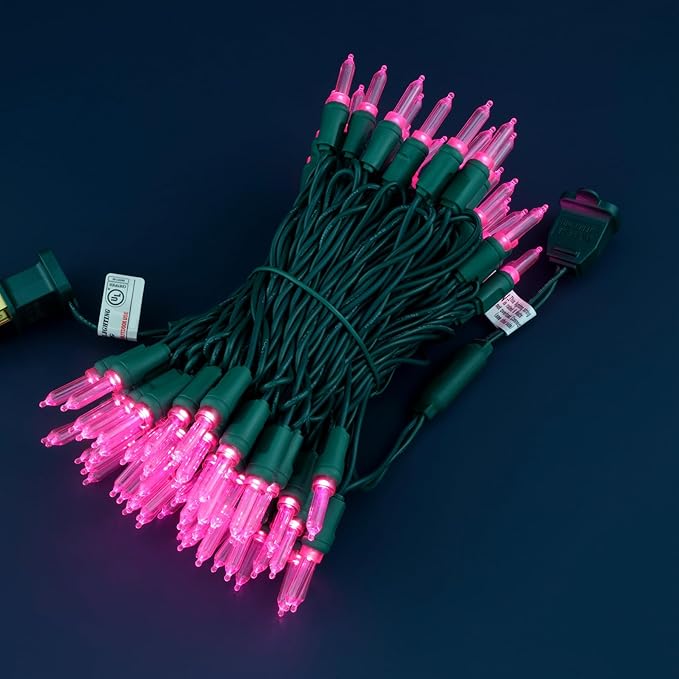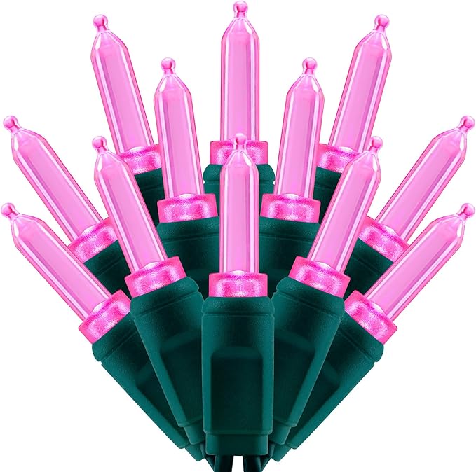 100 Pink One-Piece LED Christmas Lights, 33 ft Green Cord High Waterproof UL Certified T5 Outdoor String Lights (Pink)