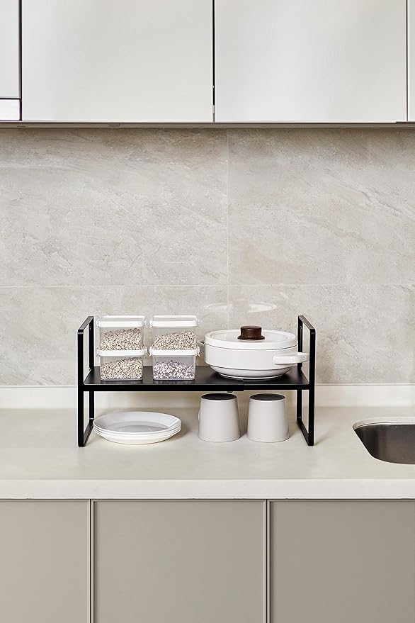 Nxconsu Cabinet Shelf Expandable Height Adjustable Organizer Riser for Kitchen Cabinet Pantry Cupboard Under Sink Countertop Organization Storage Space Saver Stackable Heavy Duty Metal Black XL