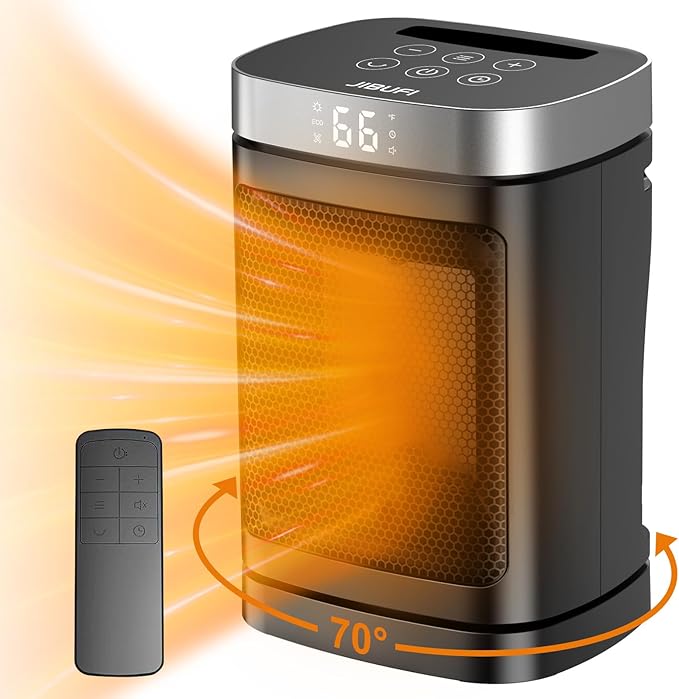 Small Portable Space Heater for Indoor Use - with 70°Rotating Feature, JIBUFI 1500W PTC Electric Heater, Rapid and Safe Heating, Remote Control, 1-12 Hr Timer for Bedroom, Office