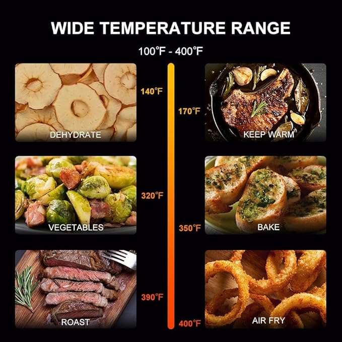 - FAST PREHEATING: From frozen to golden in minutes! Create gourmet meals by airfryer with the versatility of a temperature range of 100 to 400°F, which allows you to gently remove moisture from foods or quickly cook and crisp foods with RAMJOY 1600 watts high power system.