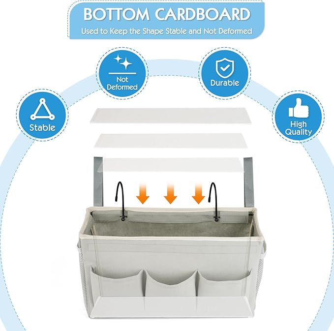 - 【Strong Bearing Capacity】In addition to the metal hook, the bedside organizer also added adjustable straps on both sides to help the bedside caddy to be additionally fixed in place, bottom cardboard added to hold basket shape, enduring enough to bear heavy weight and prevent sagging.