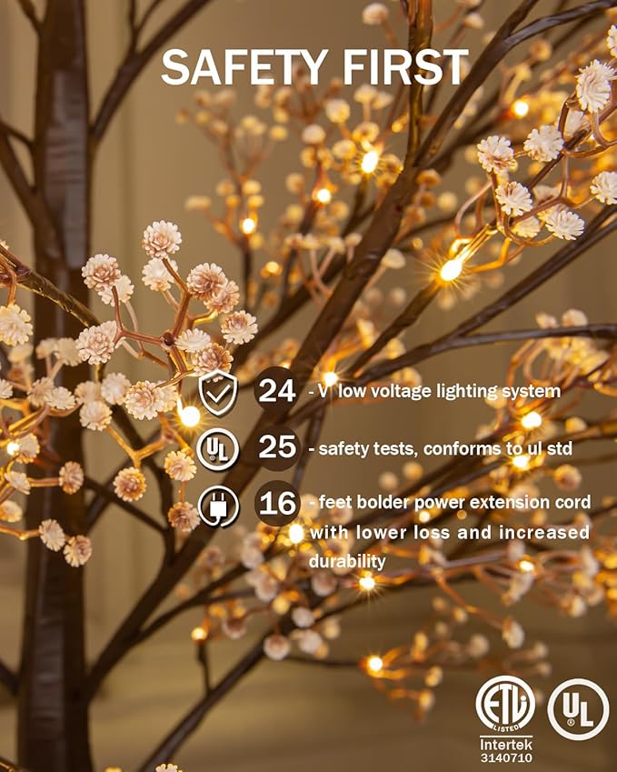 6ft Lighted Baby's Breath Tree with 184 Warm White LED Lights for Holiday Decor - Dimmable, UL Certified, Waterproof - Ideal for Indoor and Outdoor Decoration