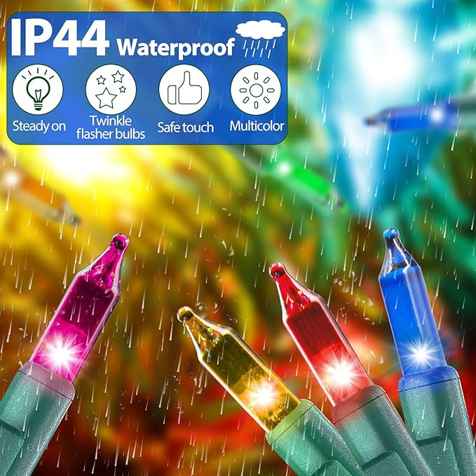 - Versatile Length:With a generous 50ft length with 200 bulbs(Actually almost 51.5FT), these Christmas string lights offer ample coverage to embellish your Christmas tree, adorn your indoor/outdoor spaces, or enhance any festive setting with their beautiful illumination. It also comes with 4 flasher bulbs , 4 extra replacement bulbs and 2 replacement fuses.