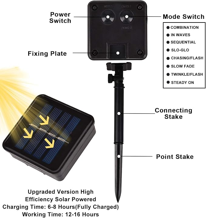 - 8 Lively Lighting Modes: Combination, in waves, sequential, slogs, chasing/flash, slow fade, twinkle/flash, and steady on