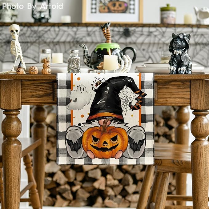 Artoid Mode Buffalo Plaid Gnome Bat Pumpkin Ghost Halloween Table Runner, Sensonal Kitchen Dining Table Decor for Home Party 13x60 Inch