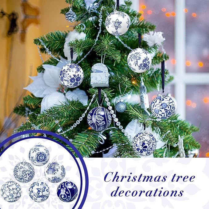 Cindeer 12 Pcs Blue and White Christmas Porcelain Balls 2.4 Inch Porcelain Chinoiserie Ornament Bulk Christmas Ceramic Hanging Decorative for Tree Home Xmas Party (Elegant Style)